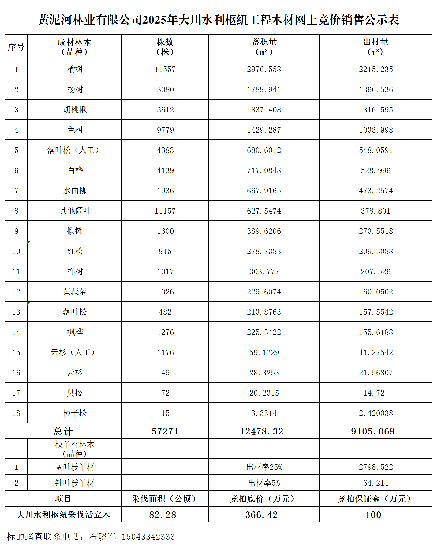 黃泥河林業有限公司2025年大川水利樞紐工程木材銷售設置一個標段,采伐木總出材9107.78m3、總蓄積12479.02m3、總株數57271株、總面積82.2779公頃、總競拍底價366.42萬元。標段相關數據詳見《黃泥河林業有限公司2025年大川水利樞紐工程木材網上競價銷售公示表》。